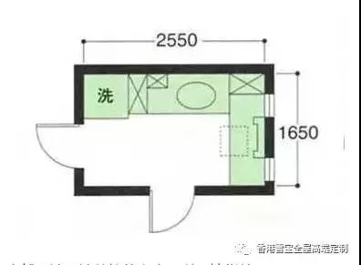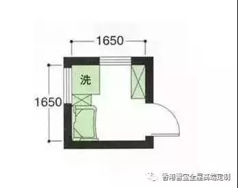 最小尺寸的布局方式,能容納一個800左右的洗面臺、收納柜以及洗衣機。